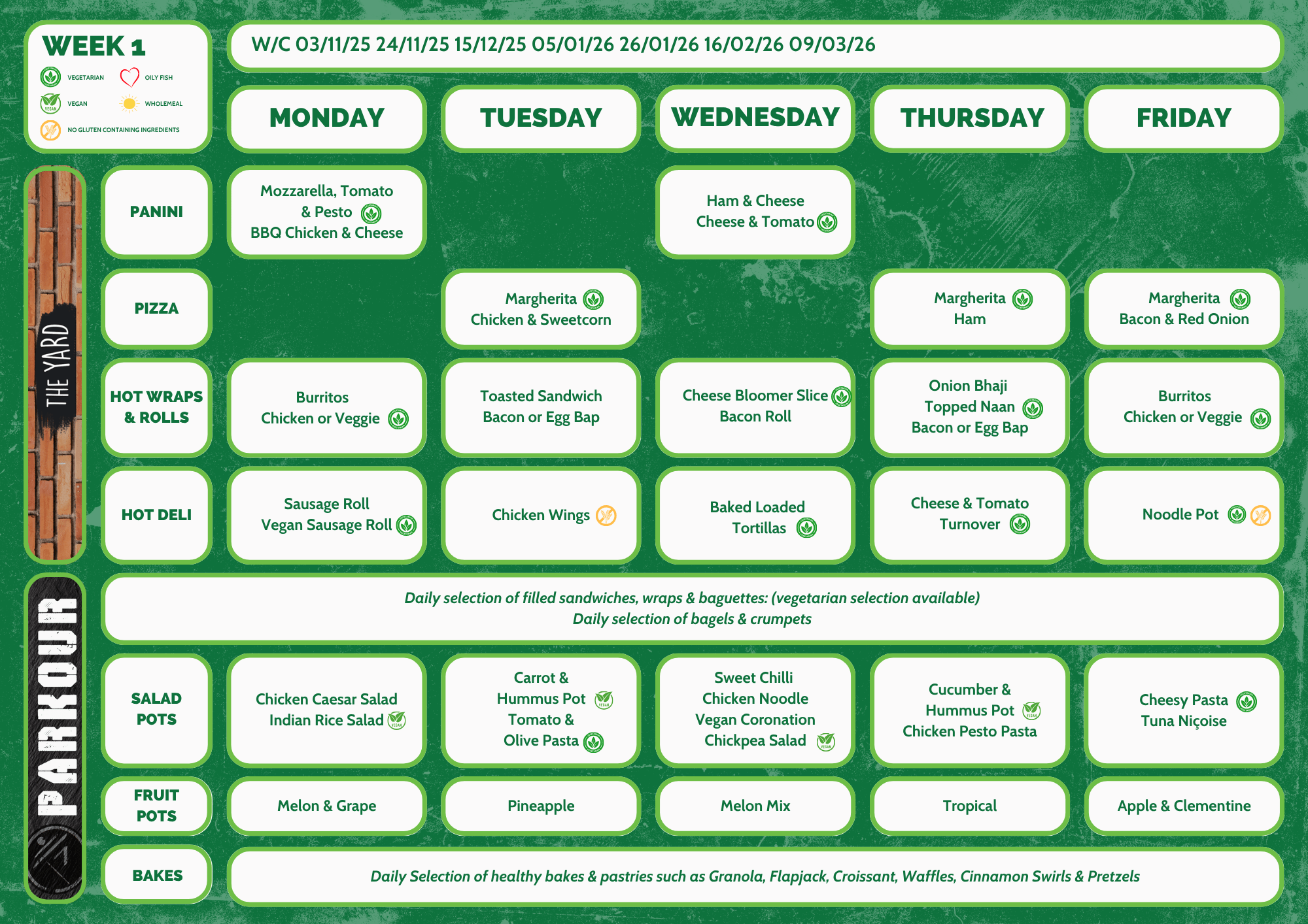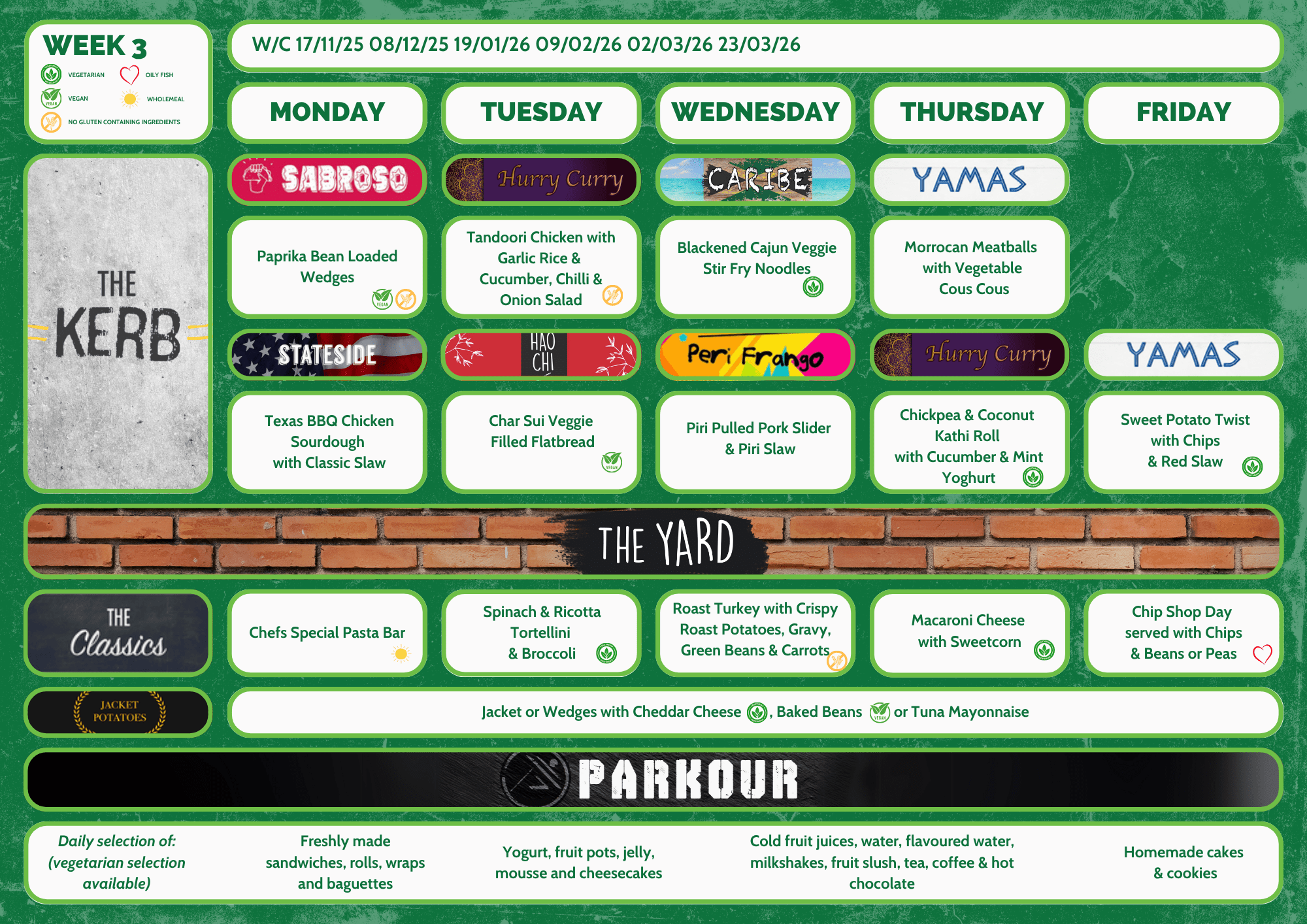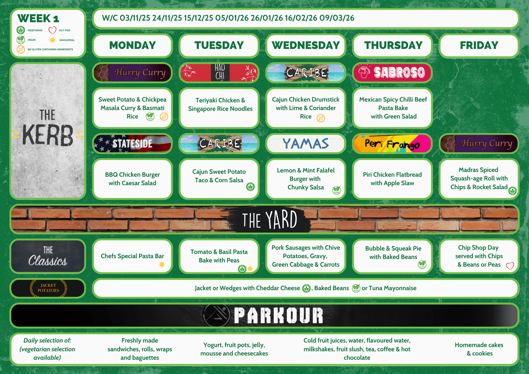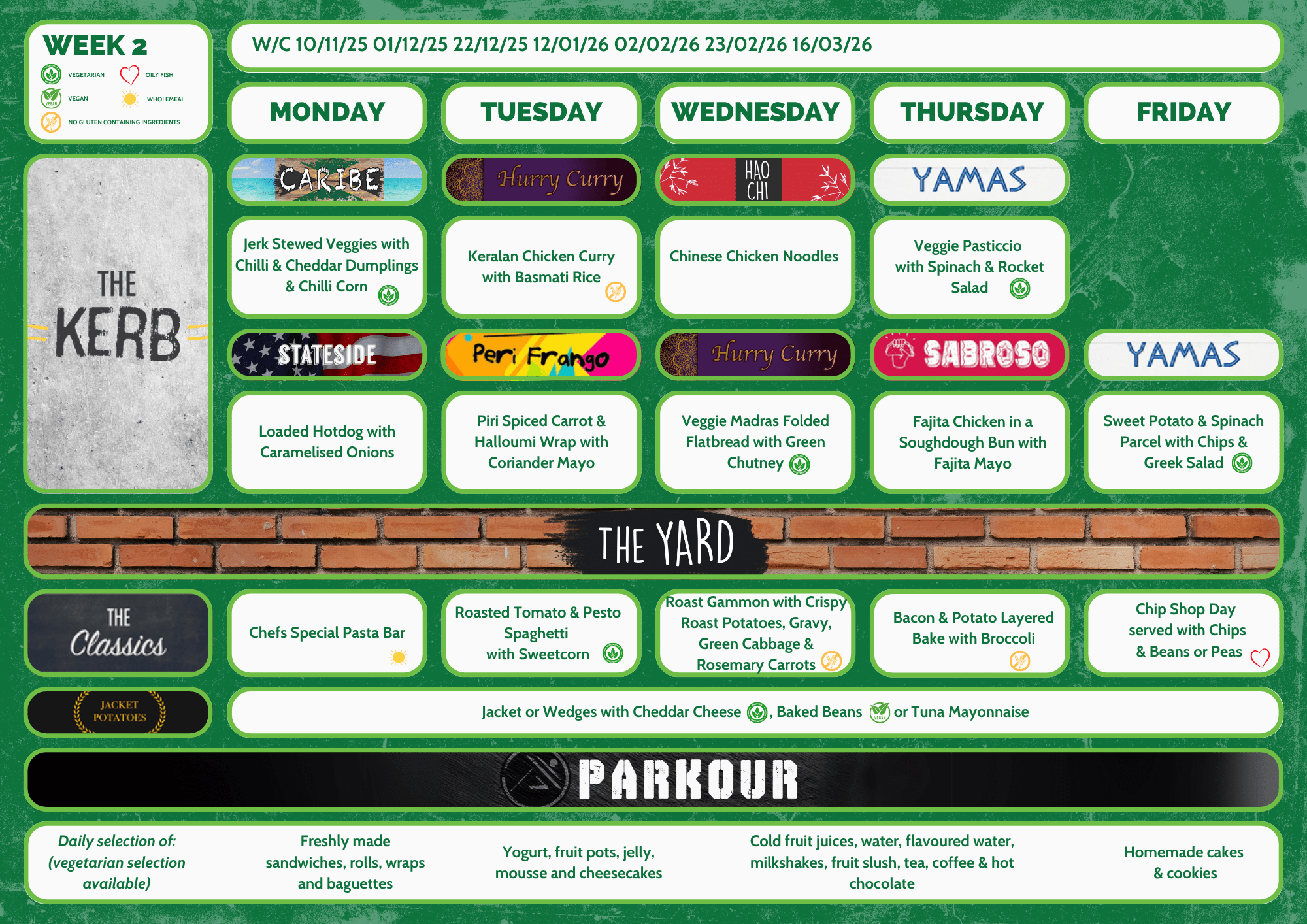 The daily menus include two food offers from around the world, as well as classic dishes, a variety of jacket potato fillings (hot and cold), a salad bar and a variety of cold grab and go items including wraps, baguettes, sandwiches and dessert items.